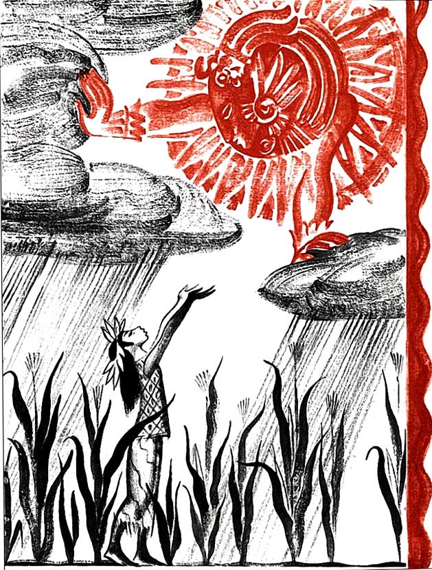 «Маис, маис, маис…» — шуршали муравьи. Они зарыли светлые зёрна в землю, и вскоре из земли поднялись высокие гибкие стебли с удлинёнными листьями и продолговатыми плодами. Из каждого плода высовывался хохолок золотистых нитей, похожих на полосы Солнца…