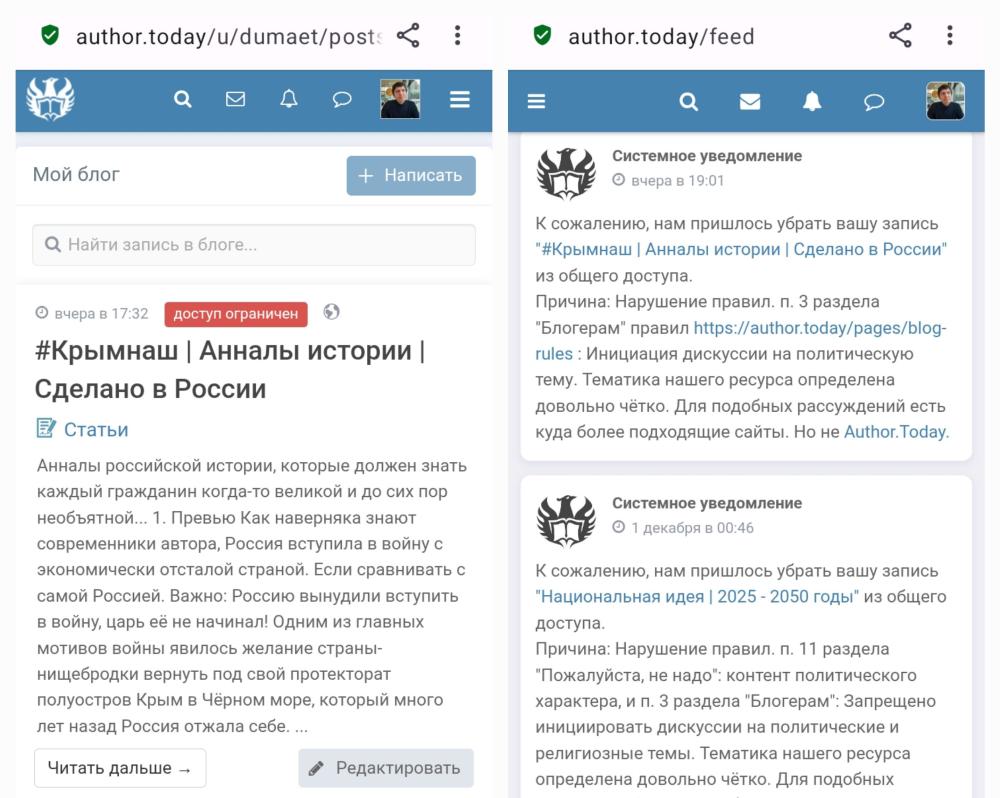 Мой аккаунт забанили из-за блога, где я писал неправильные вещи, с позиции отдельно взятого Шапина. Посты люто минусовали, ибо там на 80% тусуются идиоты, поддерживающие великого геостратега... когда я сие понял, то понял, что пора валить. Но поскольку Шапин применил админ ресурс, то у меня дилемма: